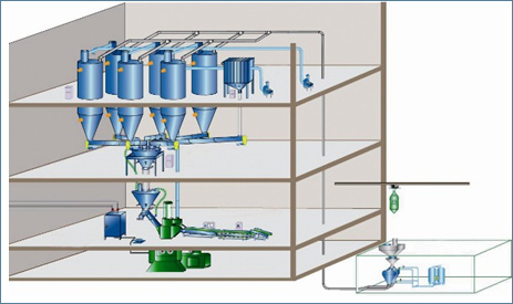 目前國內的自動混合及輸送配料系統主要由輸送設備、投料站(或者補料倉)、喂料機、稱重料斗、混合機、控制系統組成