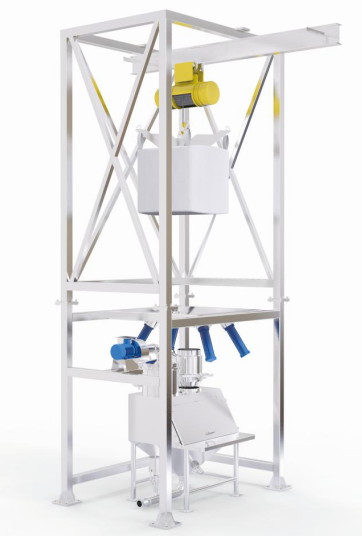 噸包拆包機采用設備自帶的電動葫蘆、叉車、行車進行物料提升,有效降低了人工勞動強度,拆包處理量大,400KG~3T均可。