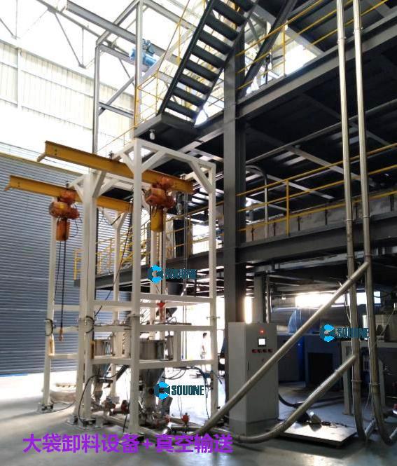 另一種是大袋開袋站是靠自身攜的帶起重設備將大袋(噸袋)吊裝到卸料機的機架上,不需用外界的幫助。